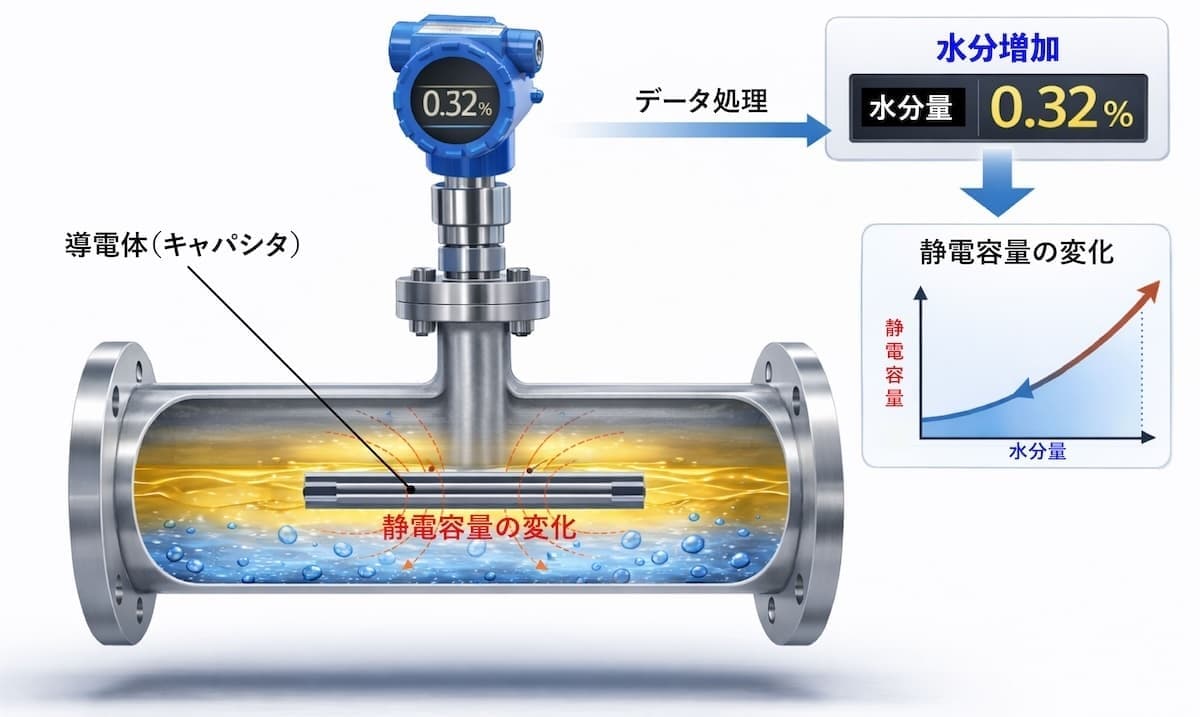 この測定法の根幹は、物質が持つ「電気を蓄える能力」の指標である比誘電率の差にあります。液中に水分が混入すると、混合液全体の誘電率が急激に上昇するため、それを電気的に検知する仕組みです。