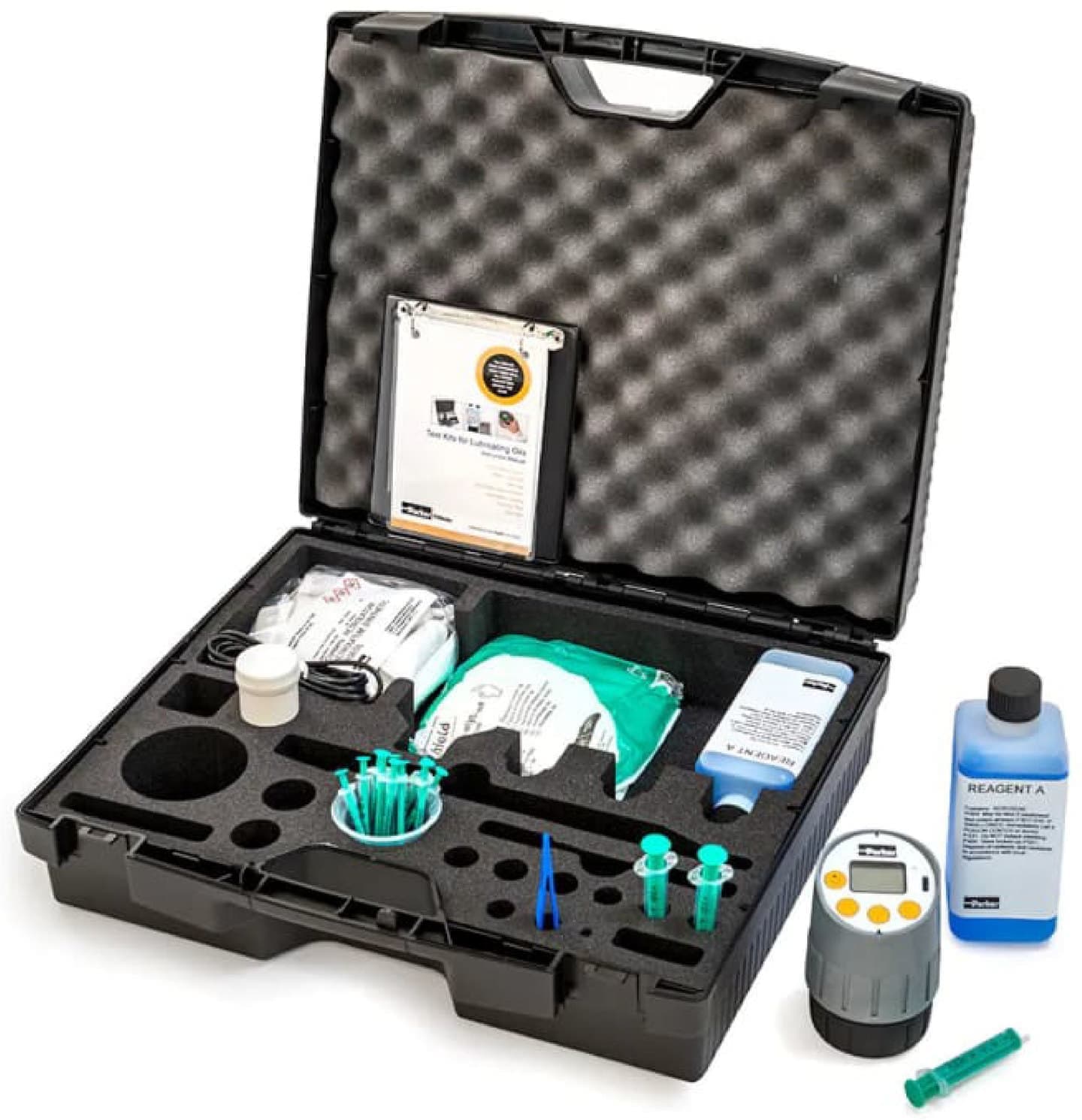 高価なカールフィッシャー水分計の精度を要求されない、日々のオイル品質管理用の水素化合物反応法(CaH₂法)を用いた油中水分テストキットです。